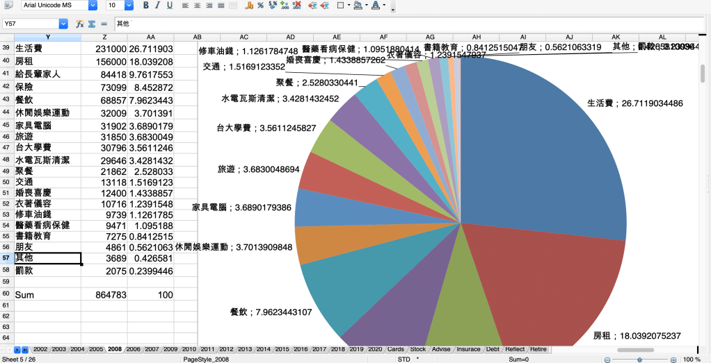 一年的帳記完了以後, 下一年度開始的時候, 我會做的事就是把去年所有花費分門別類歸納, 然後算出各項花費佔所有的花費的百分比. 可以做個圓餅圖清楚呈現每個部分的花費, 以下是我某一年的結果: