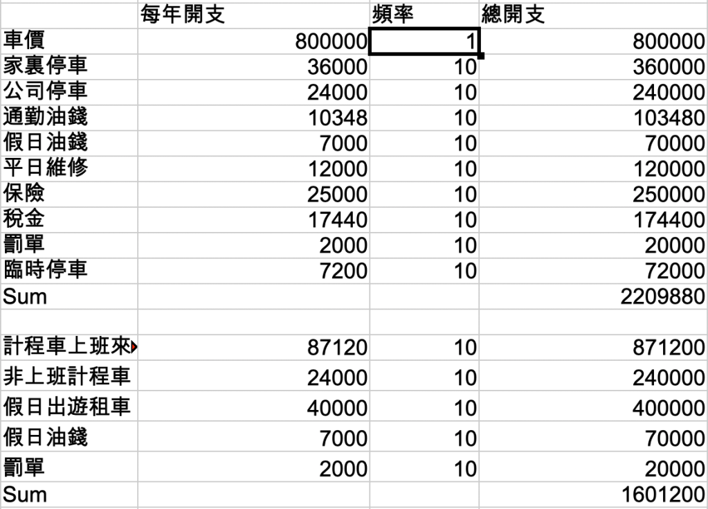 細算的唯一壞處, 在我看來, 就是整個人看起來會偏於理性. 而理性即使並不是所有人都會同意且想要遵行的, 畢竟在分析了這麼多租車買車的優劣之後, 還是會有人會認為車給自己帶來的感覺是無價的. 但大多數情形下, 我相信客觀的考察事實, 數據化事實並且細算, 長期來說會對自己的判斷帶來好處, 而且增進自己金錢的使用與投資上的正確性.