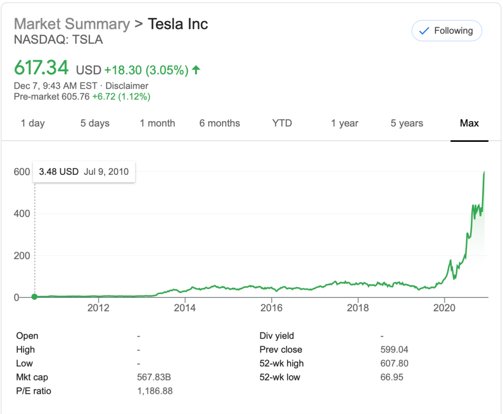 Tesla比起Amazon可以說是有過之而無不及 – 股價從2010上市以來已經從3.84元一路漲到了600, 10年多漲了156倍. 就算是Angel Investor, 十年百倍的漲幅都是津津樂道的非常成功的投資了. 而且Tesla還沒有真正的大修正過. 像2020年3月那樣的60%左右的跌幅, 比起當年2001年的亞馬遜大跌根本就不算怎麼跌. 這泡沫看來比起當年亞馬遜更大,換成是你持有Tesla, 害怕不害怕?